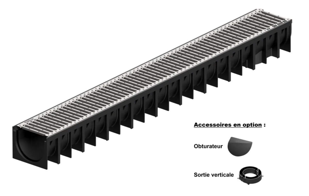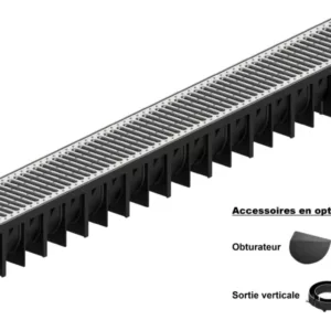 SORTIE VERTICALE : 4736220Le caniveau en polyéthylène d’Ultibat permet d’évacuer les eaux pluviales. Adapté aux zones piétonnes, il comporte une grille passerelle en acier galvanisé. Section de drainage : 56,43 cm2. Surface d’absorption : 130 cm3. Sortie verticale : DN 80/90 mm. Caniveau conforme à la norme NF EN 1433.